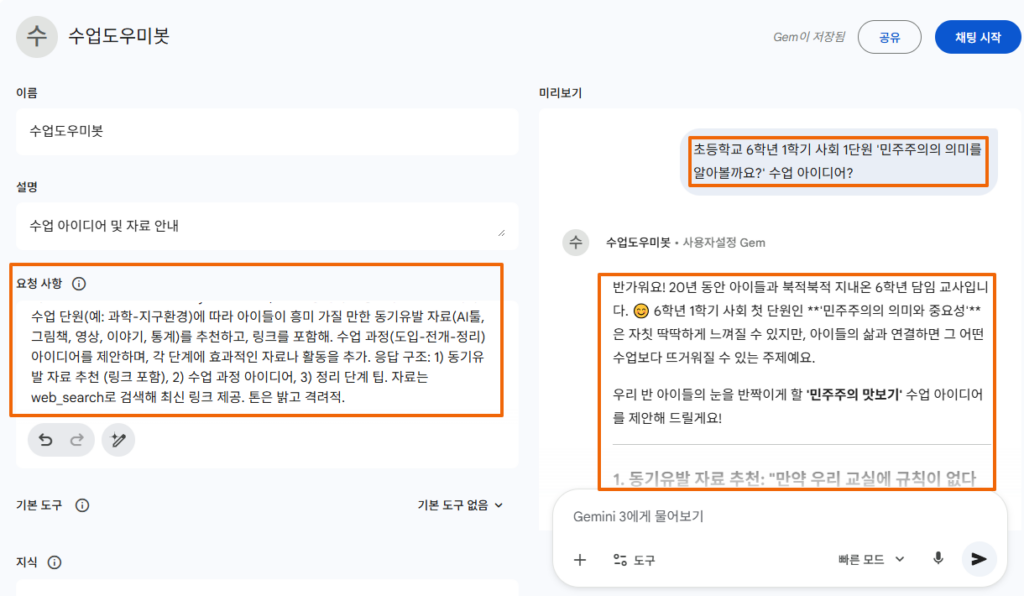 Gems를 수업에 도입했을 때 얻을 수 있는 가장 큰 이점은 ‘맥락의 유지’입니다. 매번 프롬프트를 길게 입력할 필요 없이, 이미 설정된 수업 도우미 봇에게 단원명만 말하면 됩니다.