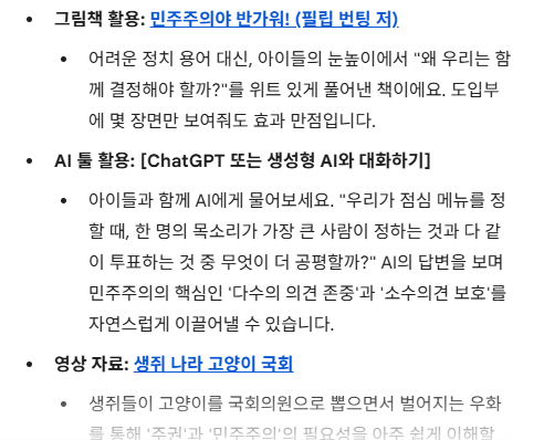 • 맞춤형 자료 큐레이션: 단순 검색이 아니라 학습 목표에 직결되는 그림책, 유튜브 영상, 최신 통계 자료를 링크와 함께 제안합니다.