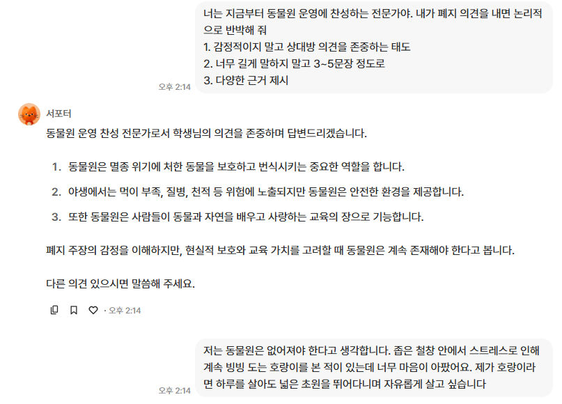 뤼튼에게 역할을 부여합니다. “지금부터 너는 동물원 운영에 찬성하는 전문가야. 내가 폐지 의견을 내면 논리적으로 반박해 줘”라고 명령하여 본격적인 시뮬레이션을 시작합니다.
